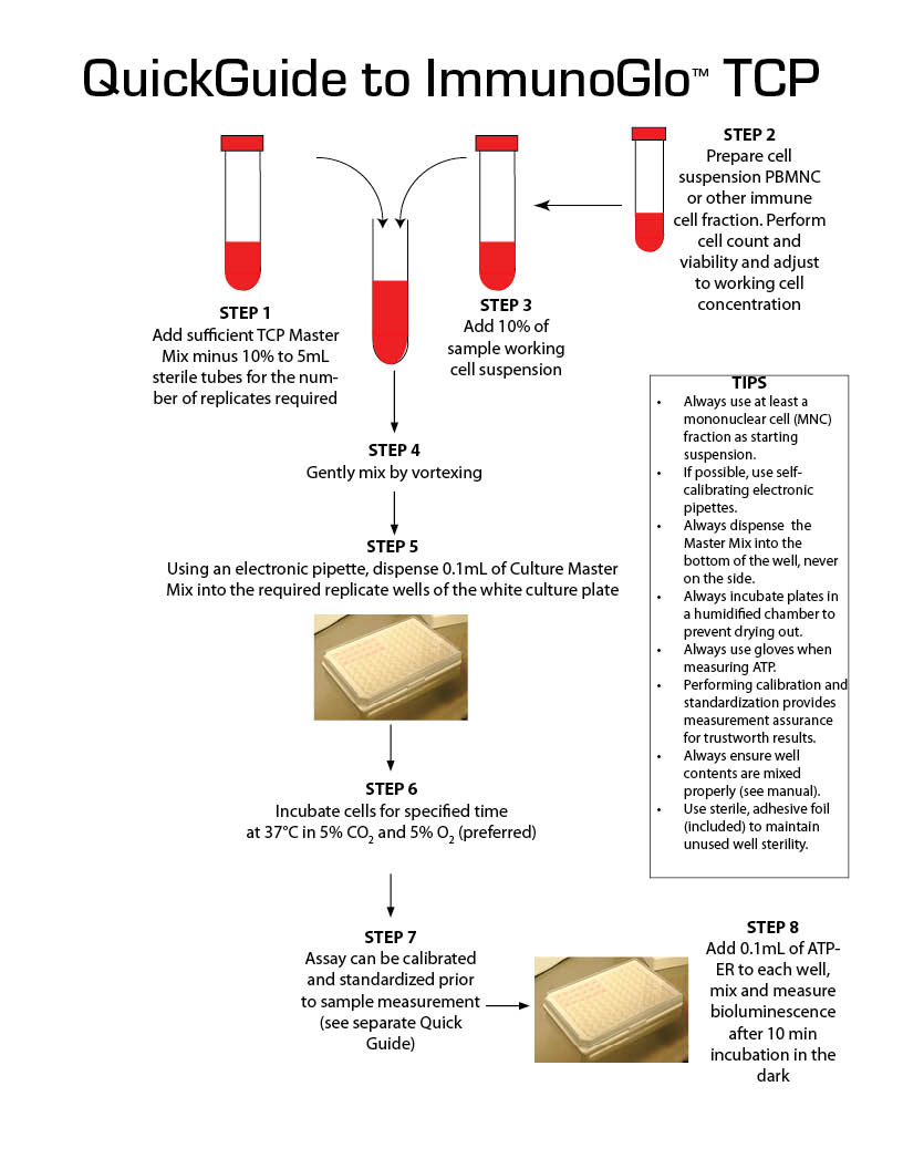 - ImmunoGlo™ TCP Assay Kits include specific cocktails to stimulate functional T-lymphocytes.